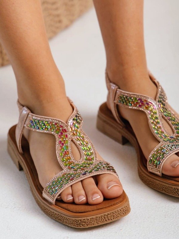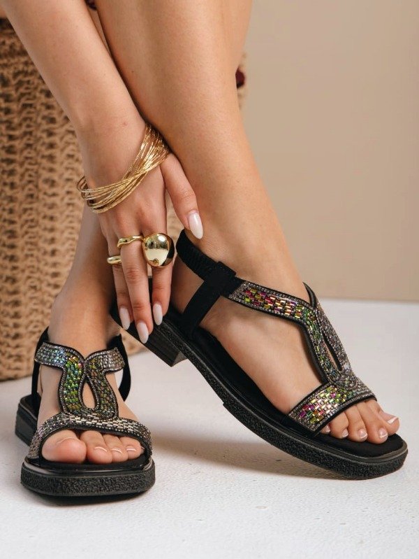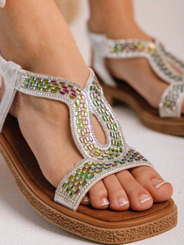 Sandalia de cuero veggie brilloso con apliques tornasolados en el empeine, ajuste elástico en el tobillo